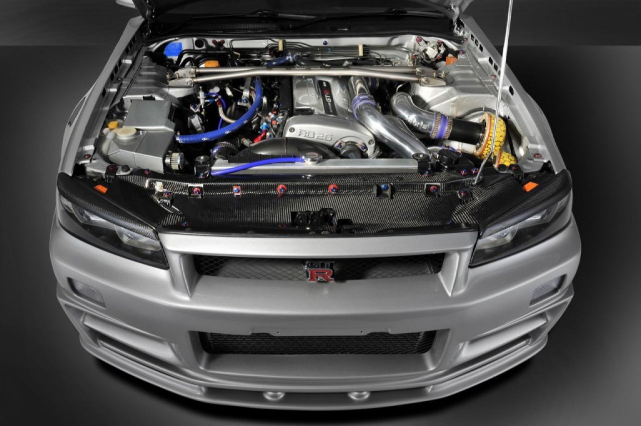 - R34 GT-R: RB26DETT de 6 cilindros en línea, biturbo. Filosofía mecánica pura.